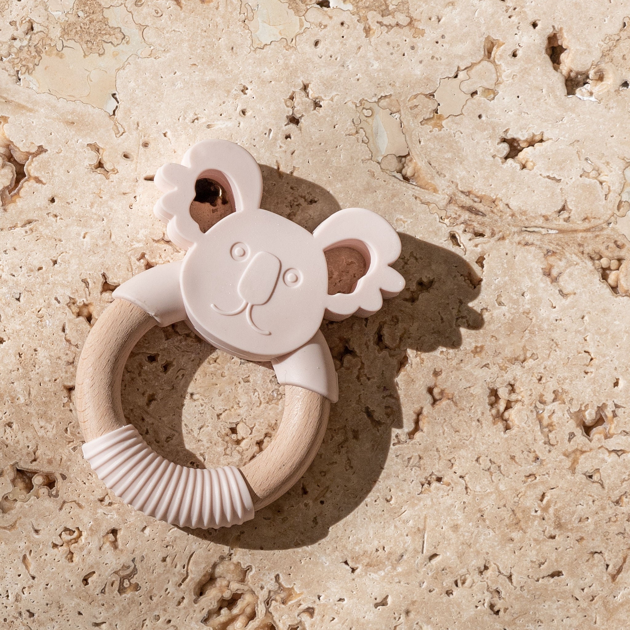 Mini and Boo koala-themed teether in food-grade silicone and beechwood – gentle texture for gum relief, natural antibacterial wood, BPA-free and safe for self-soothing babies.